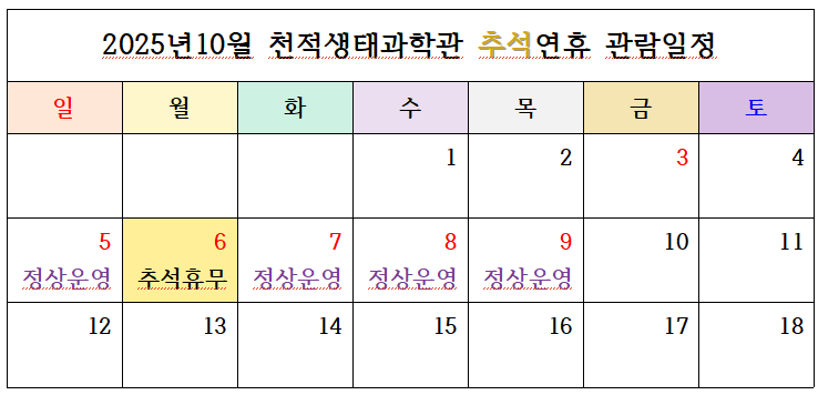 추석 관람 일정 알림 페이지 정보 작성자 천적생태과학관 작성일25-09-27 13:09 조회73회 댓글0건 관련링크 다음글 목록 본문 2025년 10월 6일(월) 추석 휴무 그 외는 정상 운영합니다. 댓글목록 등록된 댓글이 없습니다. 다음글 목록